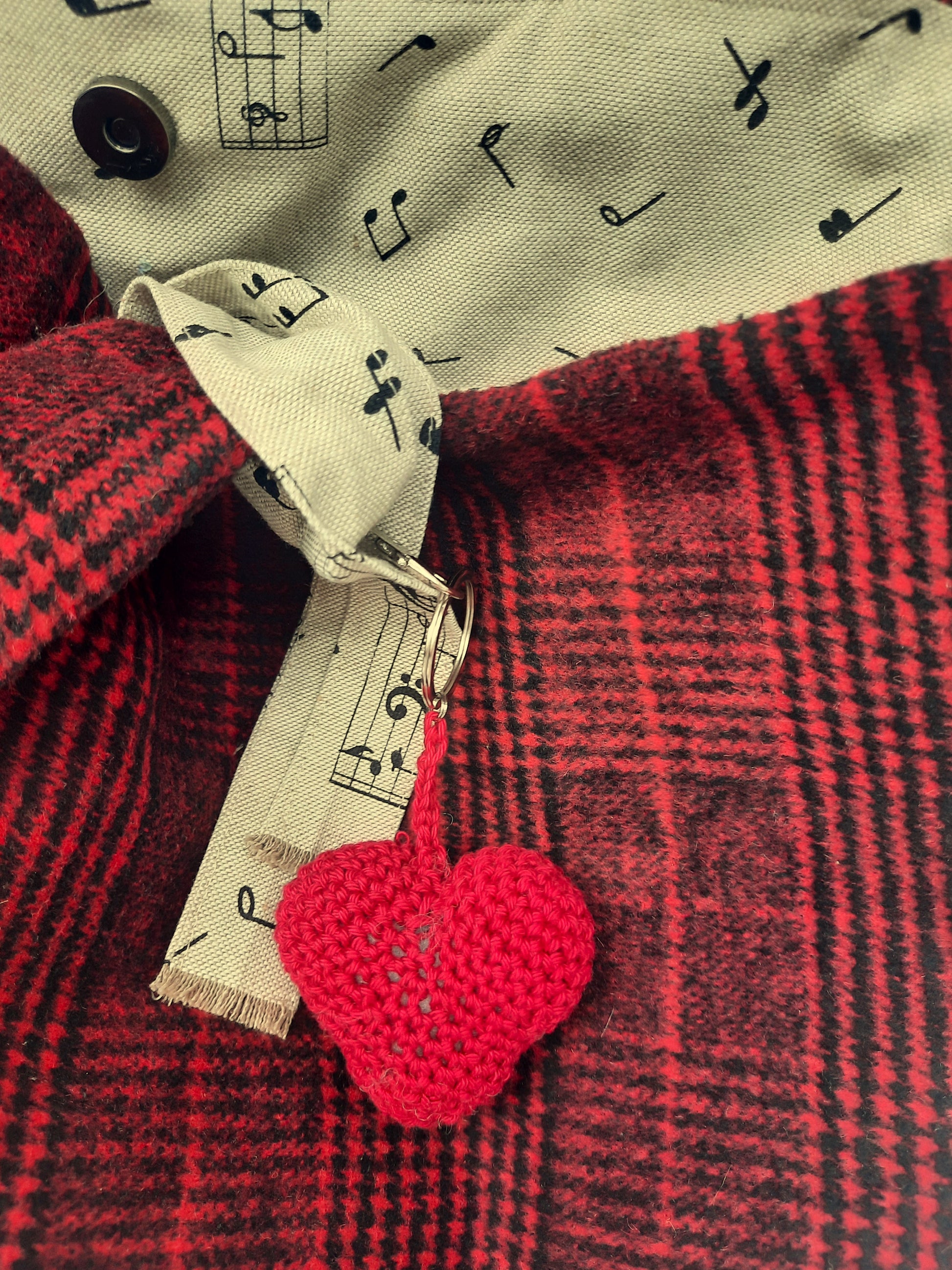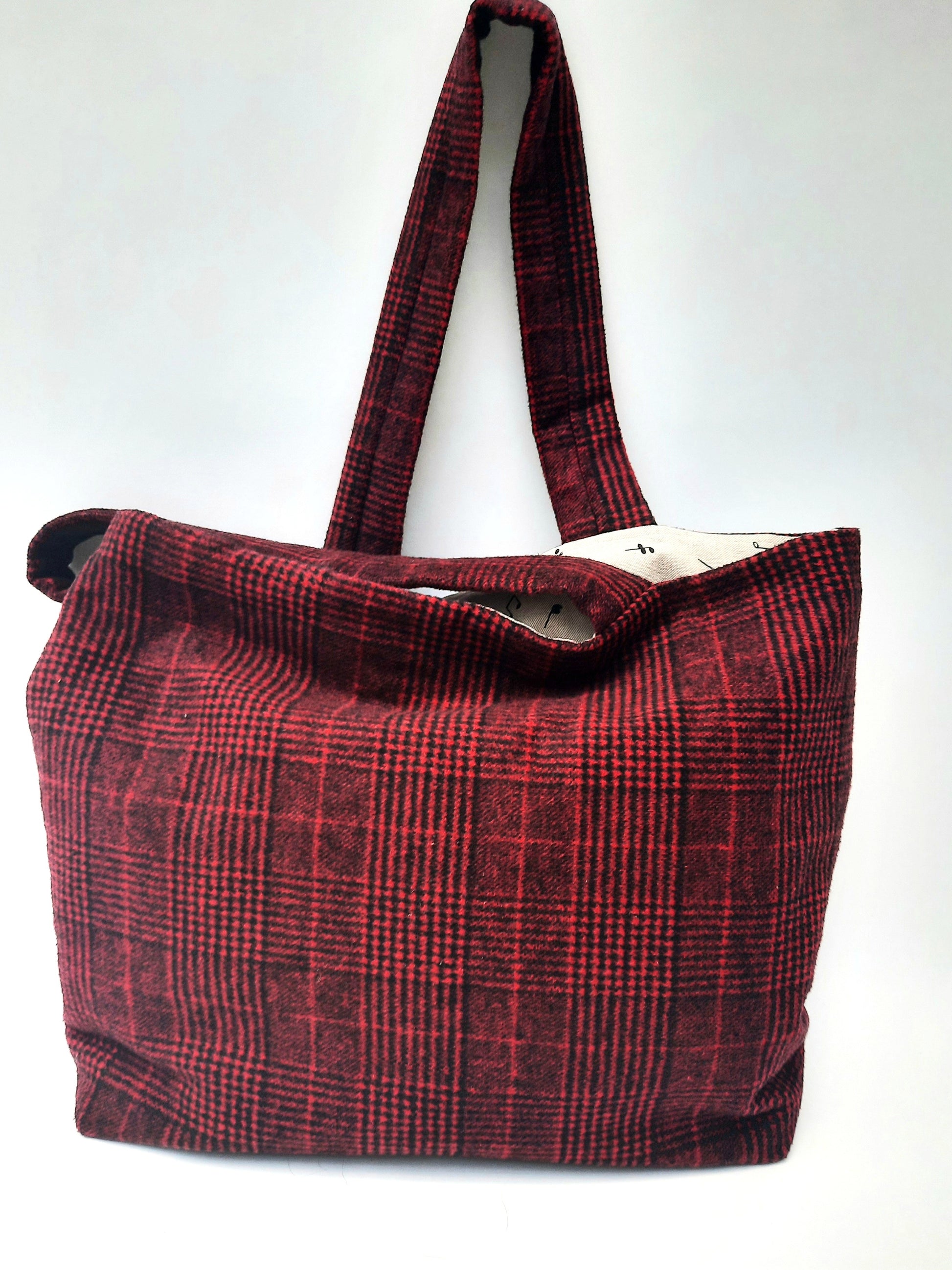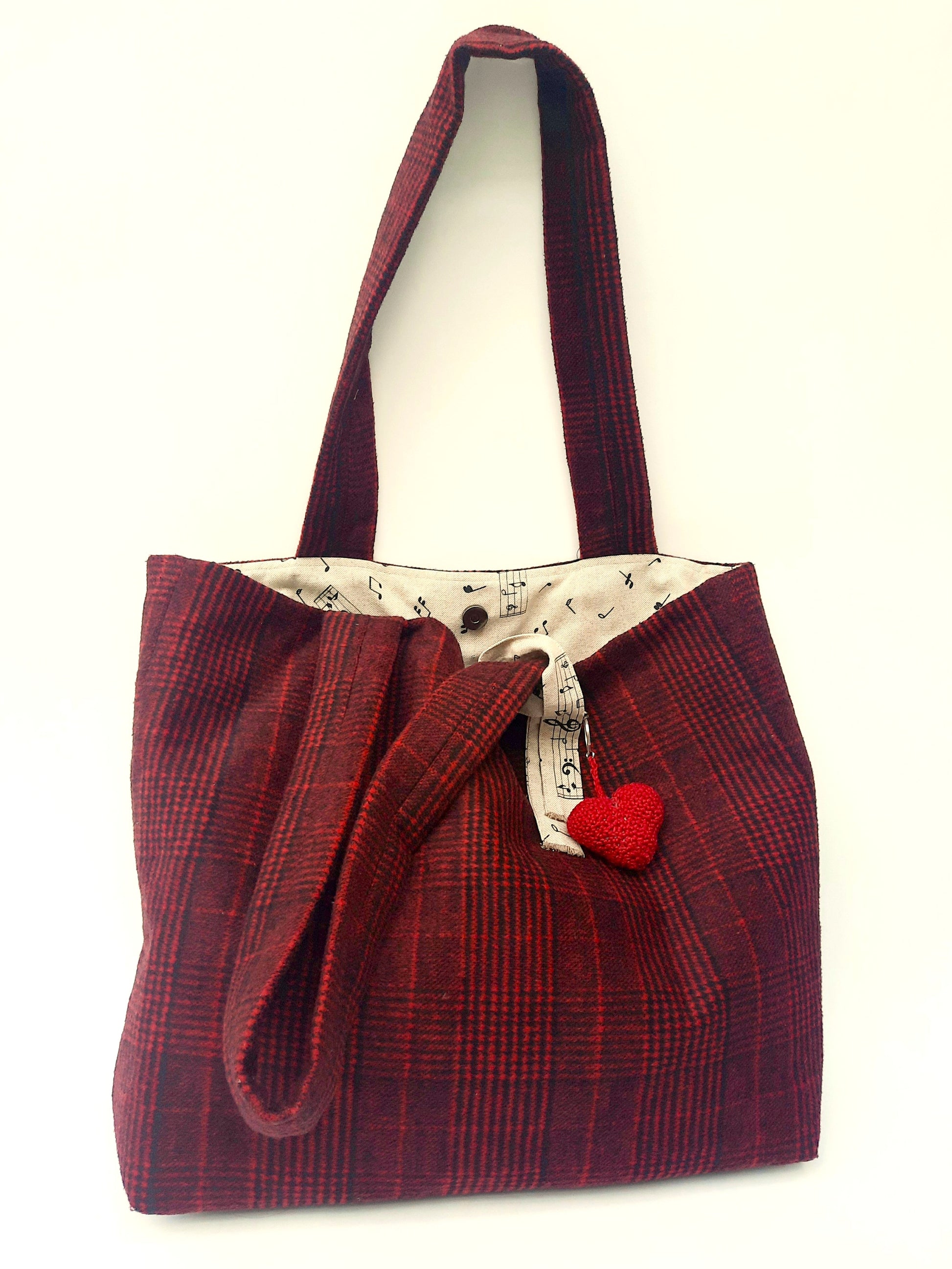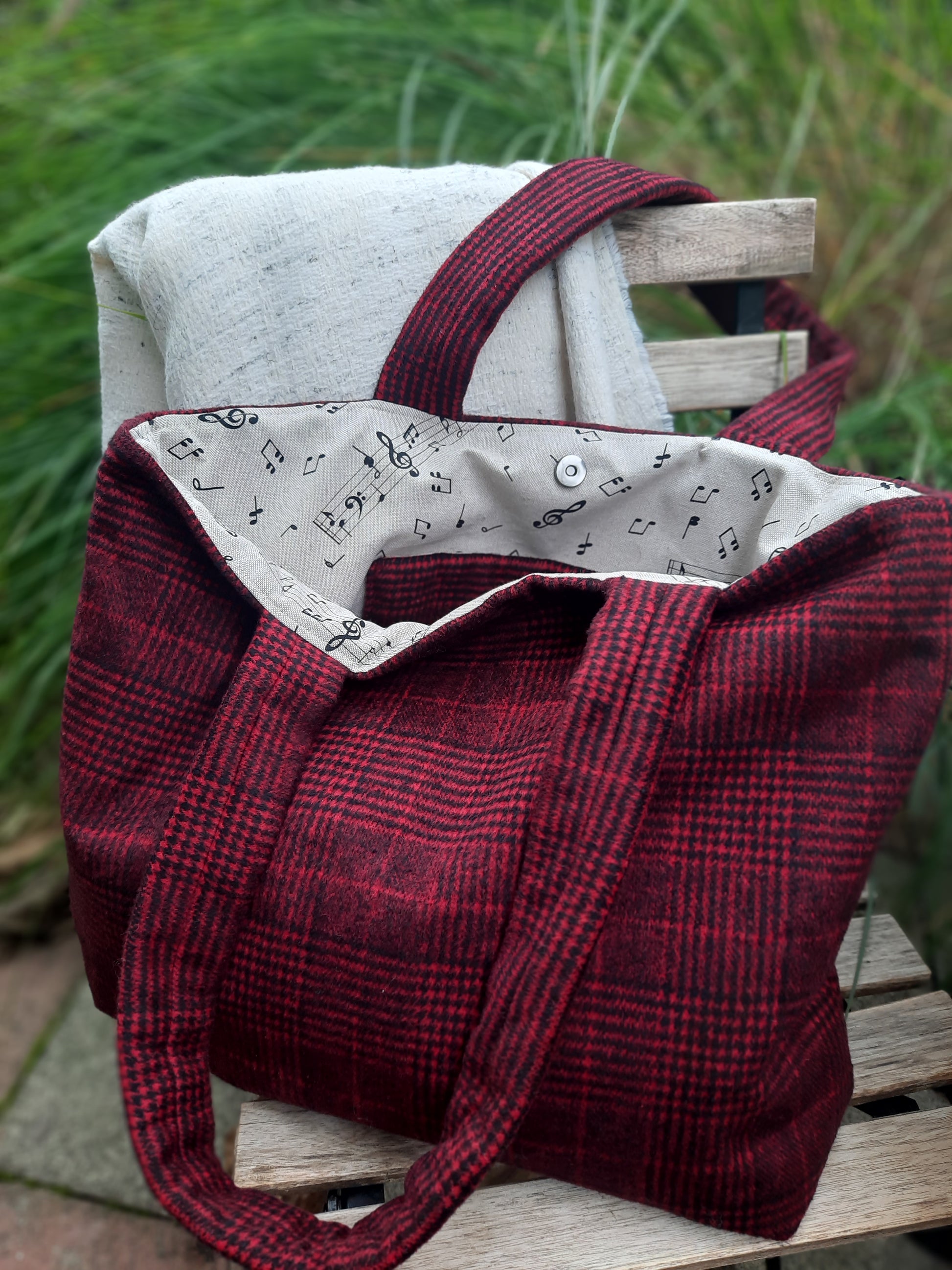 Diep rood en zwart in een klassiek ruitpatroon, gevoerd met muzieknoten, elegant met een vleugje drama, geïnspireerd op Venetië in de winter als de toeristen schaars zijn en de stad op haar mooist.