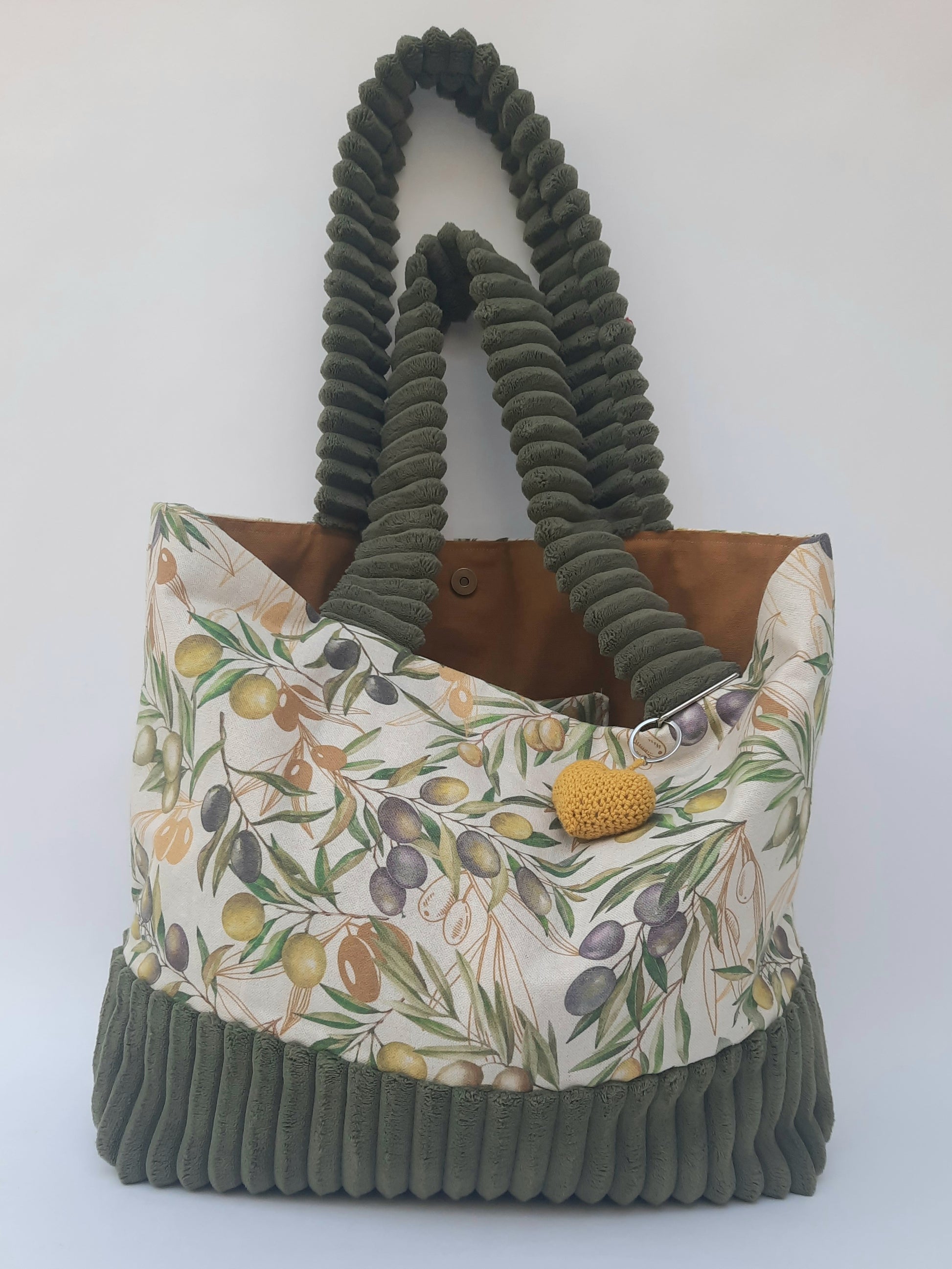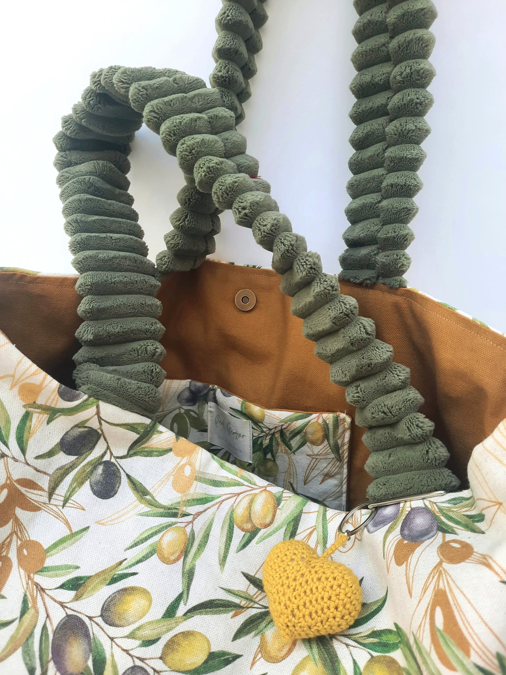 Deze tas is geïnspireerd op de olijvenoogst in Sicilië, natuurlijke tinten en warme kleuren van de herfst, opvallend, zuiders en tijdloos.