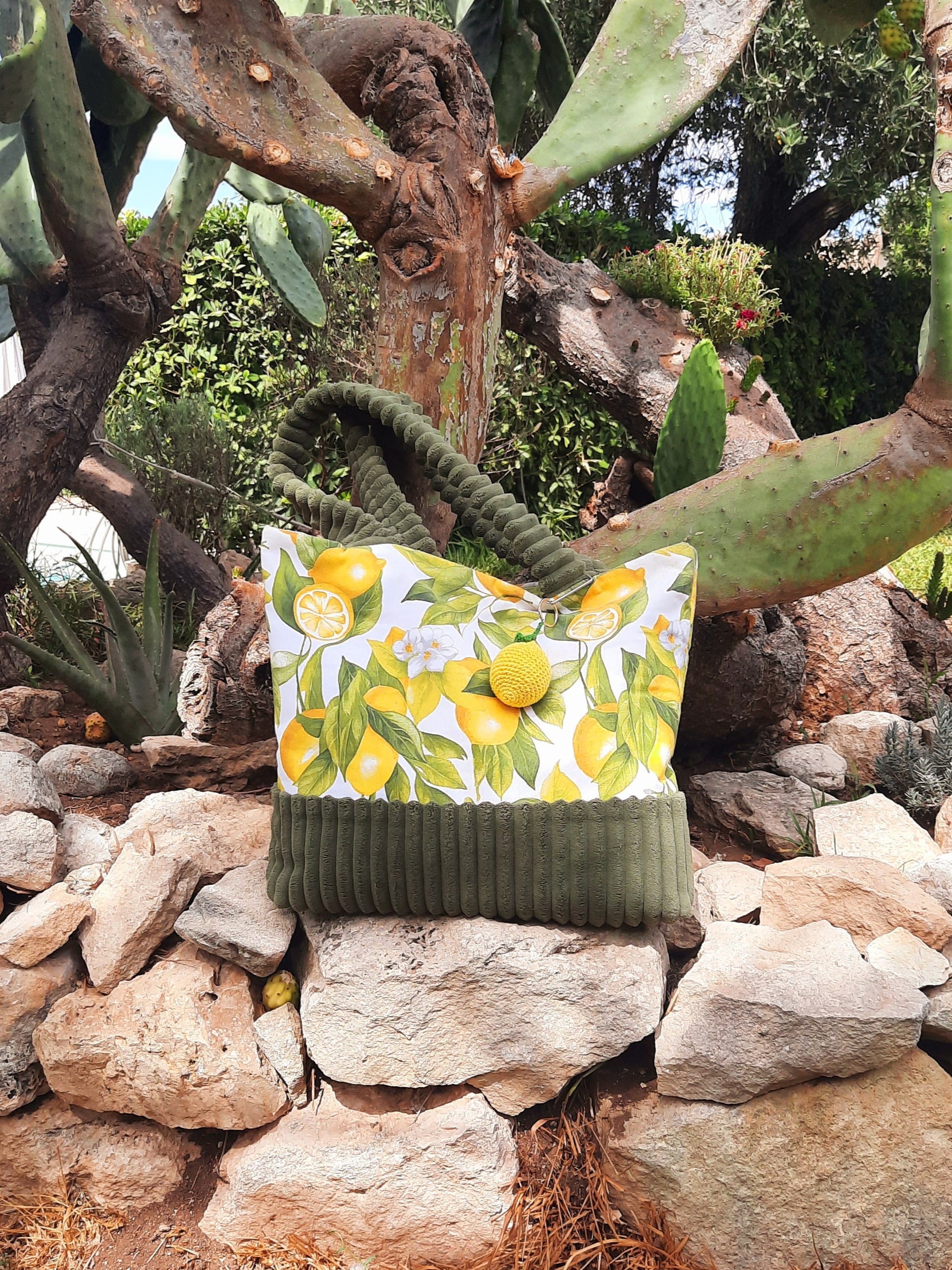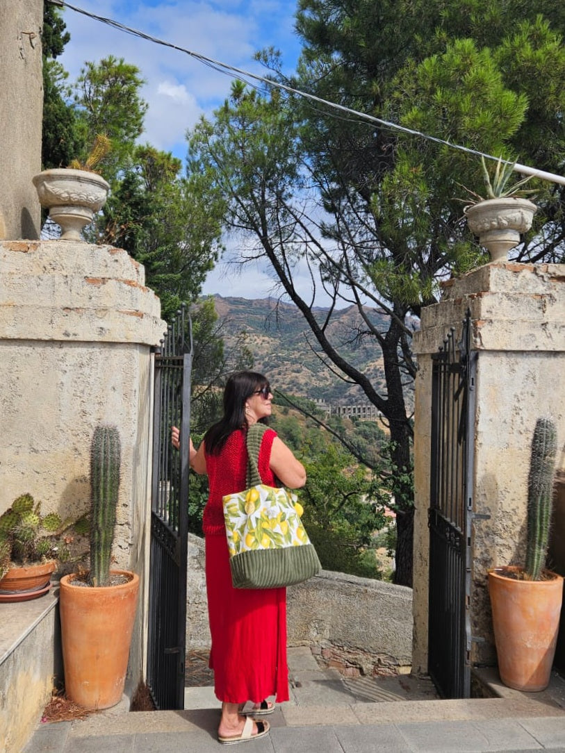 De XL-handtas combineert stevige ribfluweel met een speelse citroenprint – vrolijk, opvallend en vol Italiaanse charme.